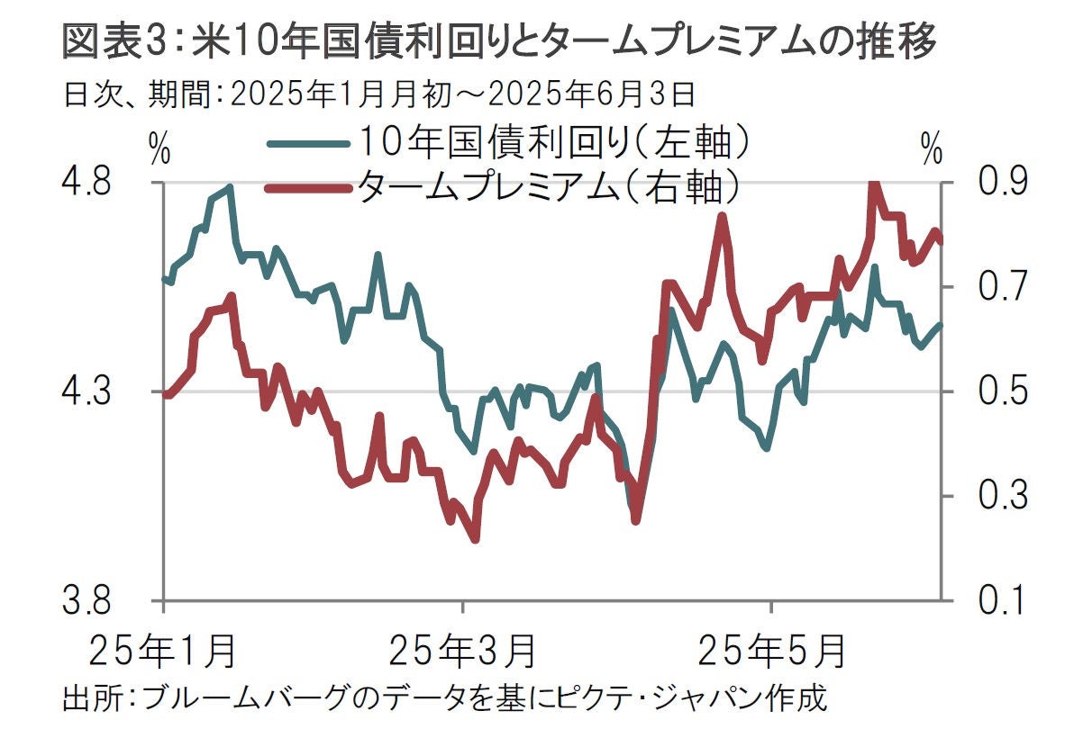 市場では財政不安が話題となる。米国債市場で長期金利の利回りが急上昇した背景と考えられるからだ。いつ頃から不安が高まったのかを利回りや、財政不安を反映するといわれるタームプレミアムから判断すると、4月前半から不安が高まったように見える。予算決議では減税規模が5.3兆ドル庁ドルとされたことなどが嫌気された。不安のピークは5月後半だった。図表2に戻ると減税延長法案が下院で可決した時期に相当する。