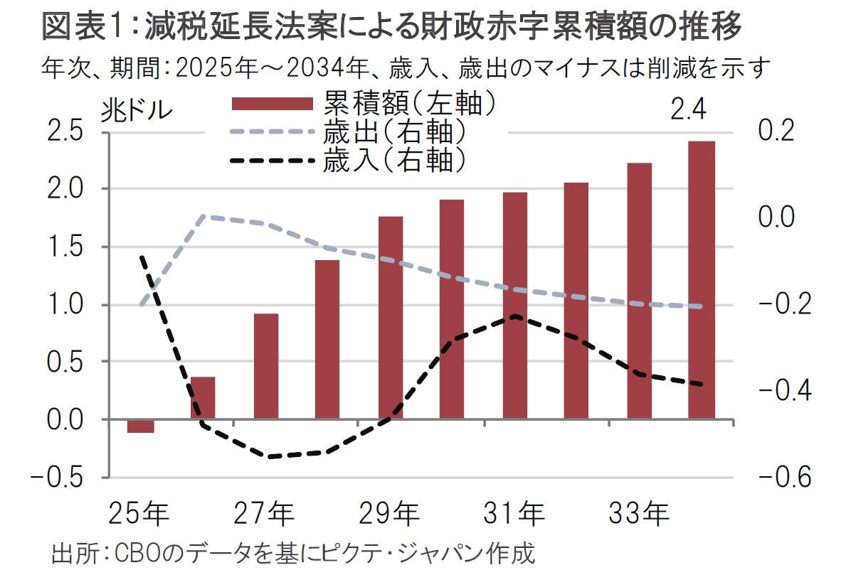 米国の独立財政機関、米議会予算局(CBO)は6月4日に米連邦議会下院が5月22日に可決した減税延長法案(1つの大きく美しい法案)の財政影響について新たな試算を公表した。CBOによると2034年までの10年間で財政赤字がメインシナリオに比べて計2.4兆ドル(約340兆円)押し上げると見積もっている(図表1参照)。
