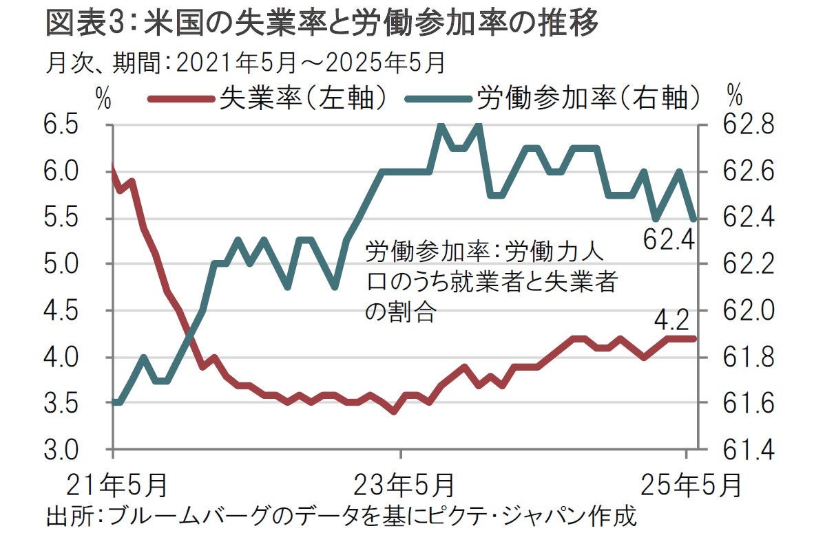 また、労働参加率(図表3参照)が62.4%と前月を下回ったことにも注意したい。労働参加率の低下は失業者が雇用環境の仕事探しを諦めた場合に低下する可能性があるからだ。その場合の失業率は見かけよりも「質」が悪いことも考えられる。