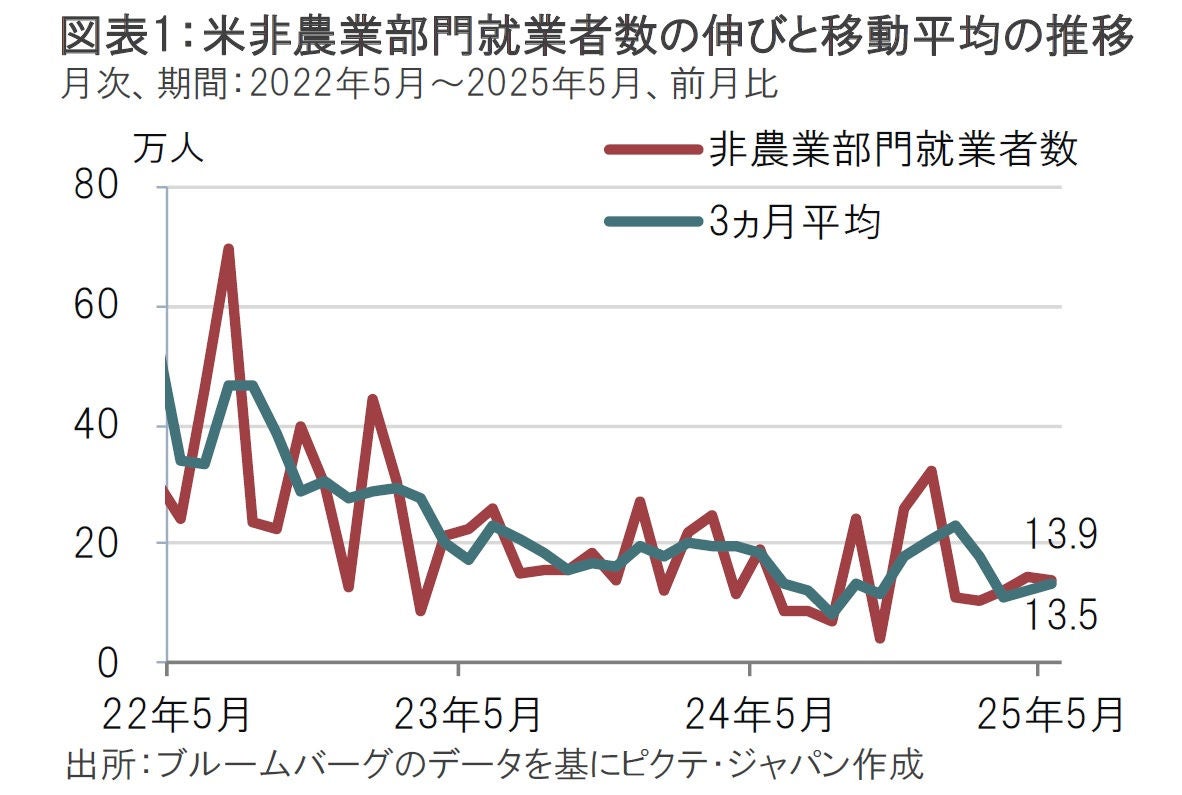 米労働省が6月6日に発表した5月の米雇用統計によると、非農業部門の就業者数は前月比13.9万人増と、市場予想の12.6万人増を上回った(図表1参照)。3月の伸びは速報値の18.5万人増が12万人増に、4月の17.7万人増が14.7万人増にそれぞれ下方修正された。
