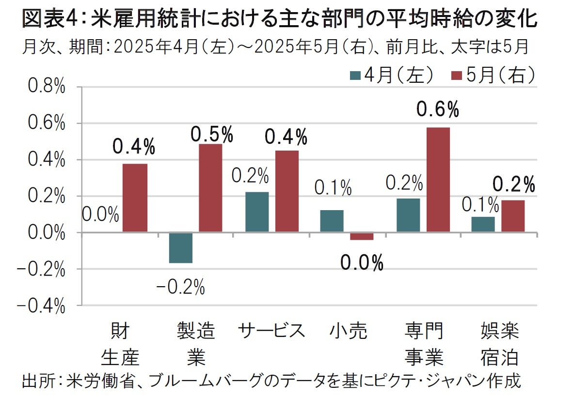 ただし、5月の前月比の伸びを部門別にみると(図表4参照)、持続性に若干疑問も残る。部門を大別すると製造業や建設業などを含む「財生産」と、小売りなどを含む「サービス」部門に分けられる。両部門とも5月の平均時給の伸びは前月比0.4%増だった。しかし、4月は財生産が0.0%、サービスが0.2%と低水準だった。テクニカルな話だが、5月はその反動で伸びた可能性もあろう。