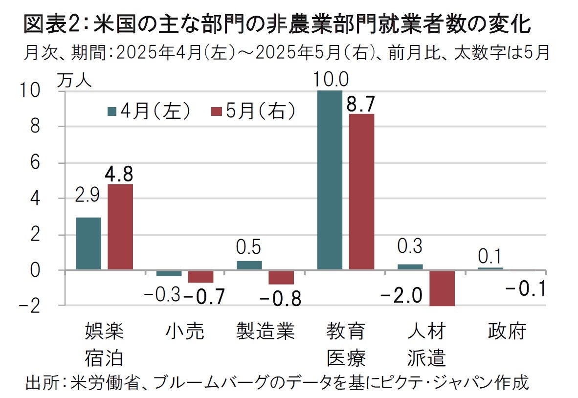 まずは非農業部門の就業者数であるが、3月、4月は合計で9.5万人下方修正されている。しかし、3ヵ月平均は13.5万人で伸びは底堅い。注目すべきは部門別の伸びだ(図表2参照)。5月に雇用が伸びた部門は「娯楽・宿泊」と「教育・医療」などに限られ、幅広い雇用の復活とは言い難い。トランプ政権が復活を期待する「製造業」は、成果が出るのはこれからなのかもしれないが、5月は前月比でマイナスと軟調だ。採用の先行指標となる傾向がある「人材派遣」も前月比でマイナスだ。