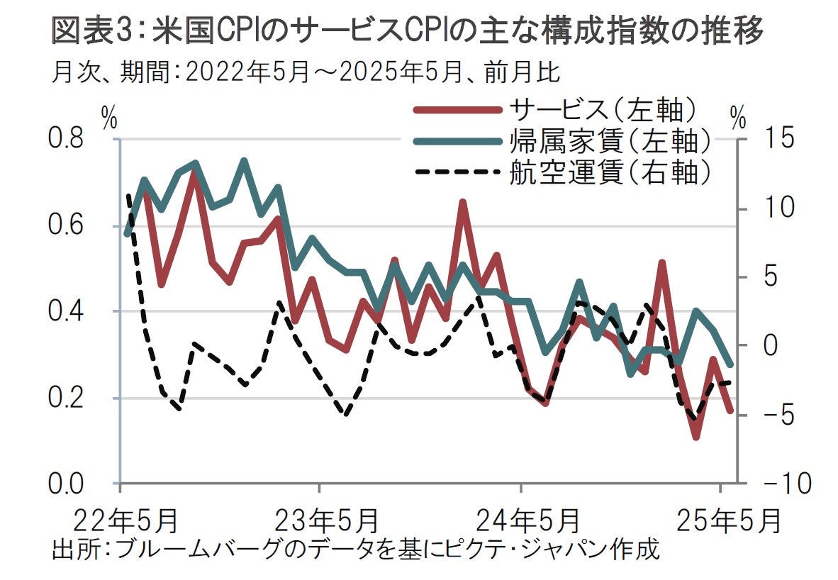 一方、サービスの中でも個人消費を通じて関税の間接的な影響が出やすい分野、具体的には航空運賃や宿泊費は前月比で下落した。関税の影響は消費者マインドを悪化させたが、消費者が支出を抑制した結果、航空運賃のように価格が伸び悩む品目もあったようだ。