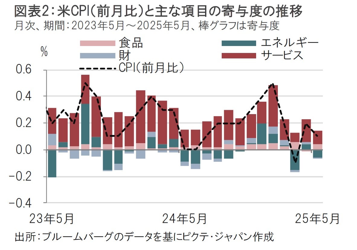 最初の理由は関税の影響が出やすい財価格の落ち着きだ。総合CPIの前月比の伸び(5月は0.1%上昇)を、エネルギー、食品、財、及びサービスの4項目に分けて寄与度をみると(図表2参照)、財価格の寄与がほぼみられない。5月の財価格は前月比でほぼ横ばい(-0.04%)だったことがこの背景だ。しかし、個別品目をみると、中国からの輸入が多い玩具や(前月比1.3%上昇)や洗濯機(2.3%)など4月の伸びを大幅に上回る品目も見られた。なお、関税の影響は少ないだろうが、処方箋医薬品なども5月は上昇した。