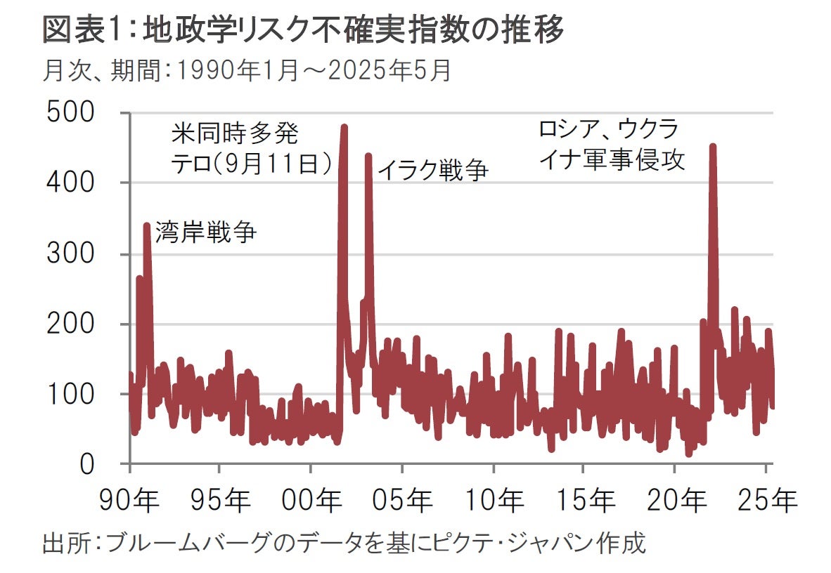 一方でイランのミサイルによる報復攻撃により、イスラエル側にも被害が出ている。両国の戦闘がエスカレートすることや、戦火が中東全体に広がることで、過去の地政学リスクで見られたような不確実性の上昇(悪化)に見舞われることはないのか不安が先立つ(図表1参照)。市場は先週末から、かたずをのんで戦闘の推移を見守っている。