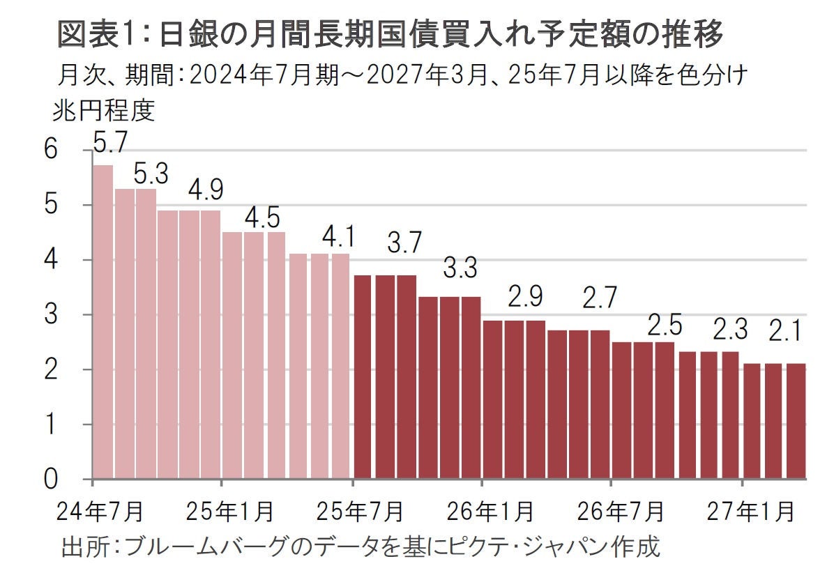 日銀は予見可能性を重視して事前に削減ペースを通知してきた。今回の発表では26年3月までの前回の予定が維持されたが、26年4月以降は四半期で2000億円ずつの減額ペースに緩められた。図表1で買い入れ額が2.9兆円から2.7兆円と2000憶円の減額となった個所以降が該当する。