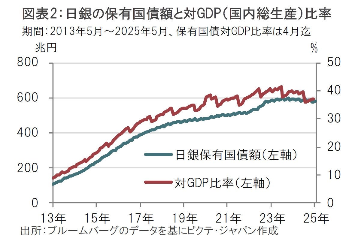 まず、記者会見で質問が多かった長期国債買入れ減額を振り返る。日銀は異次元緩和で肥大したバランスシート上の保有国債を減らすため(図表2参照)、24年8月から月間の国債の買い入れ額を減らす量的引き締め(QT)を開始した。減額開始前の24年7月の買い入れ額は図表1にあるように月約5.7兆円だった。これは日銀の保有国債の月次償還額と同程度であったためバランスシートの規模を維持する購入額だったが、QTを発表後の24年8月から月間買入れ額を削減した。