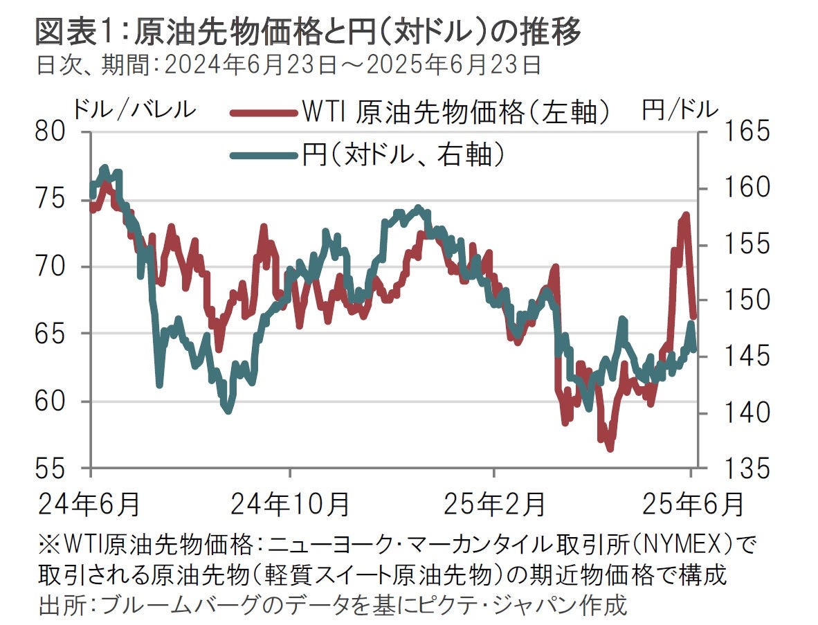市場の緊張は急速に高まり、原油価格は急上昇した。為替市場では様々な憶測があったが、「有事のドル買い」が強まり、1ドル=148円台まで円安・ドル高が進行する局面もあった(図表1参照)。