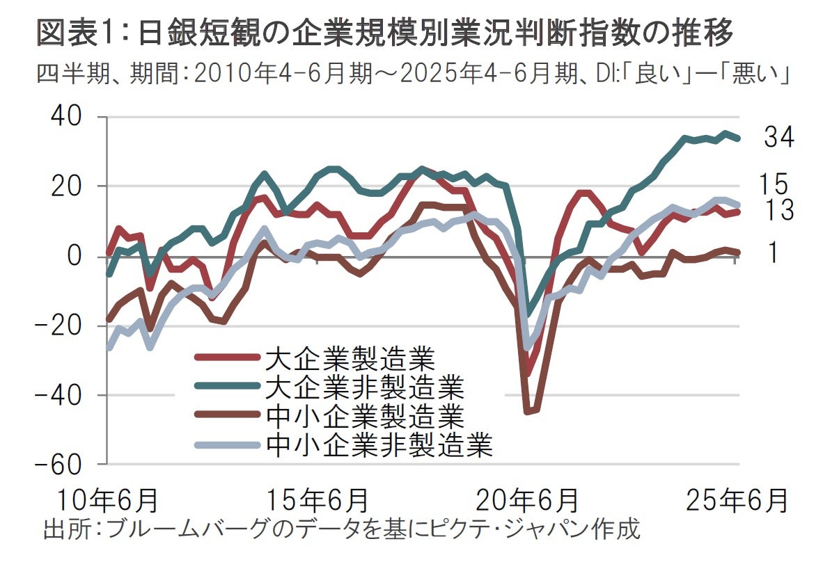 日銀は7月1日に6月の全国企業短期経済観測調査(短観)を発表した。大企業製造業の景況感を示す業況判断指数(DI)は13と、市場予想の10、前回(3月調査)の12を上回った(図表1参照)。大企業非製造業の業況判断DIは34と、市場予想とは一致したが、前回の35を下回った。