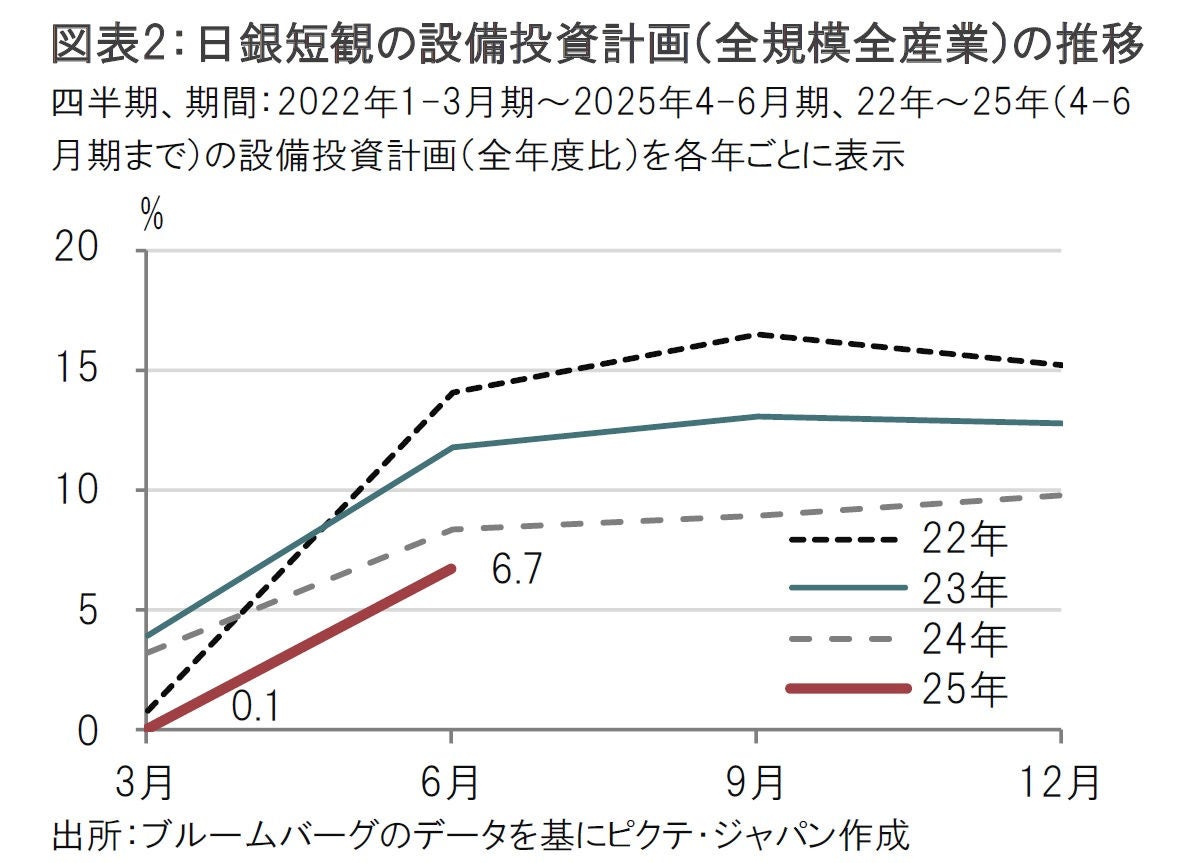 年度計画では、25年度の設備投資計画(全規模全産業、含む土地投資額)が前年度比で6.7%増と、前回調査時点の0.1%を上回った(図表2参照)。設備投資計画は3月から6月にかけ上方修正されるのが通例だが、今回の改善幅は6.6%と過去平均を上回り堅調とみられる。トランプ関税などにより不確実性が高まったことを、日銀は慎重な金融政策(据え置き)の背景としてきた。不確実性の高まりの影響を受け低下しやすいといわれる設備投資だが、計画の数字は堅調だ。