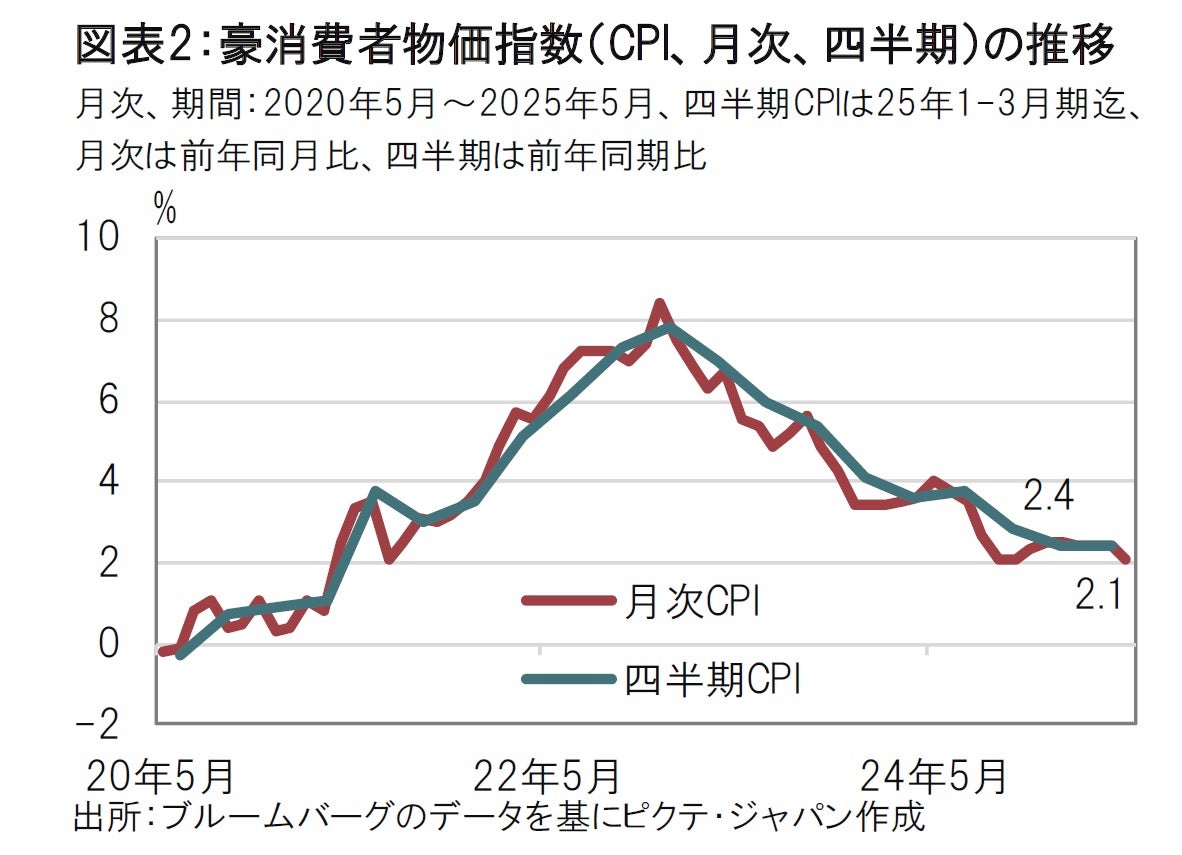 2つ目はインフレ鈍化だ。5月の理事会以降に発表された主なインフレ指標は月次の消費者物価指数(CPI)の4月と5月分(図表2参照)で、伸びは4月が前年同月比で2.4%、5月は2.1%への鈍化だった。豪中銀の物価目標は2%~3%であり、政策金利を引き下げても不思議ではないだろう。