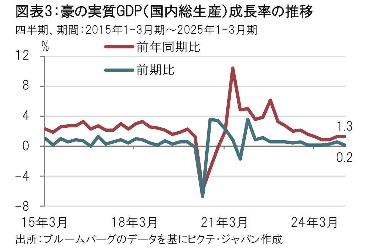 念のため、豪の経済成長率を確認すると、6月4日に発表された1-3月期のGDP(国内総生産)成長率は前期比が0.2%増、前年同期比が1.3%増と低水準で利下げは歓迎されそうだ(図表3参照)。