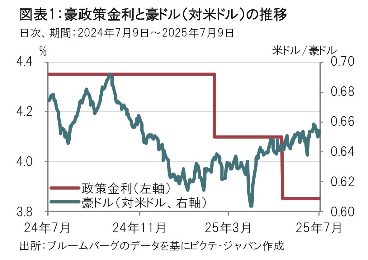 オーストラリア(豪)準備銀行(中央銀行)は7月8日に、政策金利を3.85%で据え置くことを発表した(図表1参照)。市場では、大半が0.25%の利下げを見込んでいただけにサプライズとなる決定だった。豪中銀のブロック総裁は記者会見で、国内経済の動向や米国の関税政策などの影響を見極めるために金利をいったん据え置いたと説明した。