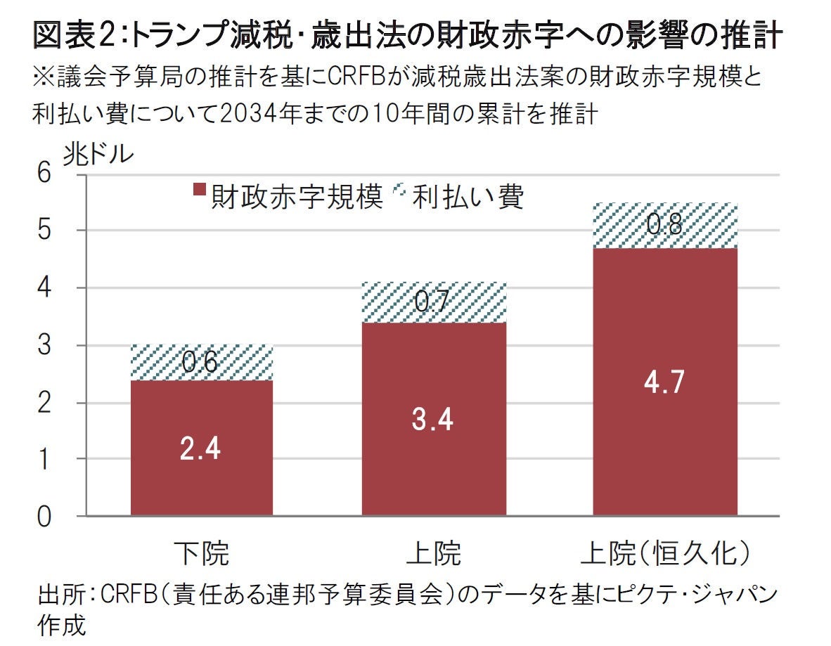 なお、これらの財政赤字の規模の推計は、法案の可決内容に基づき試算されている。仮に減税措置が恒久化された場合を仮定すれば、規模はさらに膨らむこととなる。