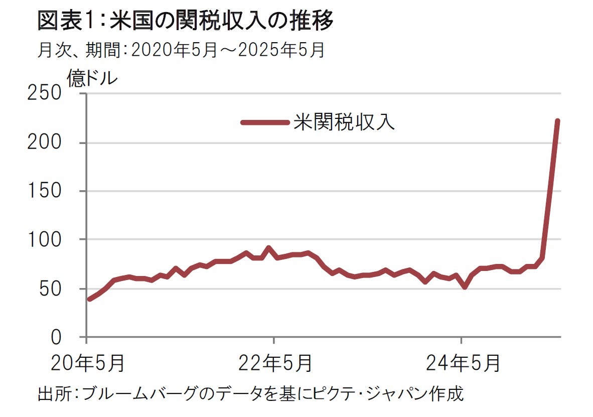 ベッセント米財務長官は7月8日の閣議で、25年に入ってからの輸入品への関税収入が約1000億ドルに達したとした上で、25年通年では「3000億ドルを大きく超える可能性がある」と述べた(図表1参照)。トランプ大統領による関税引き上げにより、関税収入が加速していると指摘した。なお、トランプ政権は25年4-6月期から輸入品に対し一律10%の相互関税を課した上で、鉄鋼・アルミニウムと自動車へは品目別関税を適用している。