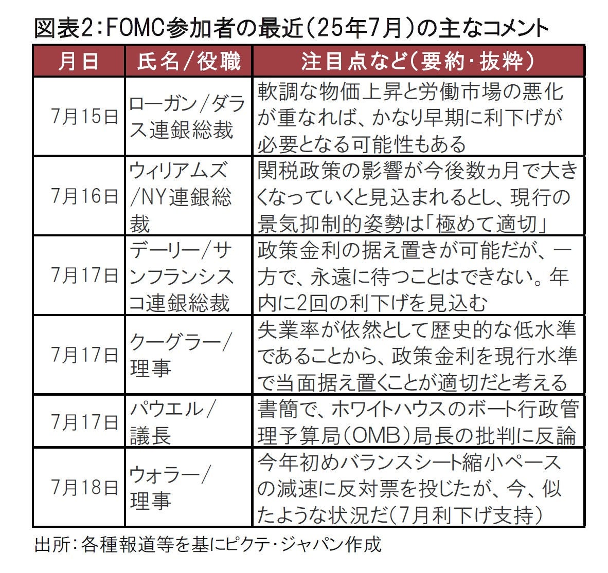 サンフランシスコ連銀のデーリー総裁や、クーグラー理事、図表2の発言内容には記載していないが、パウエル議長らも同様の見解だ。ベージュブックは物価について夏の終わりに関税の影響で上昇する可能性を指摘している。当面は様子見を続けたいという大半のFOMC参加者のコメントとも概ね整合的だ。トランプ関税(相互関税)についても多くの国では8月1日頃をめどに関税税率などを発表する予定であり、そこまでは「待つ」というのは合理的な判断だろう。