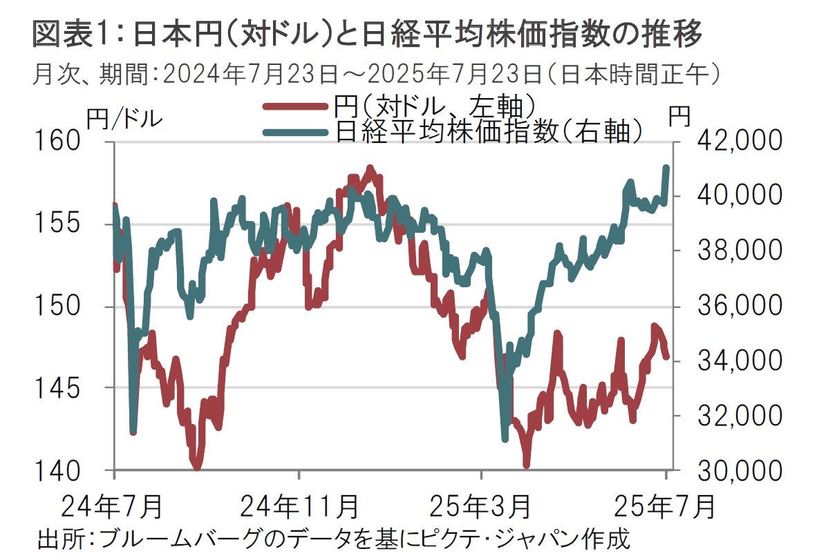 参議院選挙で与党が敗北し、関税交渉が停滞するとの懸念もある中での急転直下の合意を受け、市場では円が上昇し、株式市場は税率15%という結果を評価して急上昇した(図表1参照)。