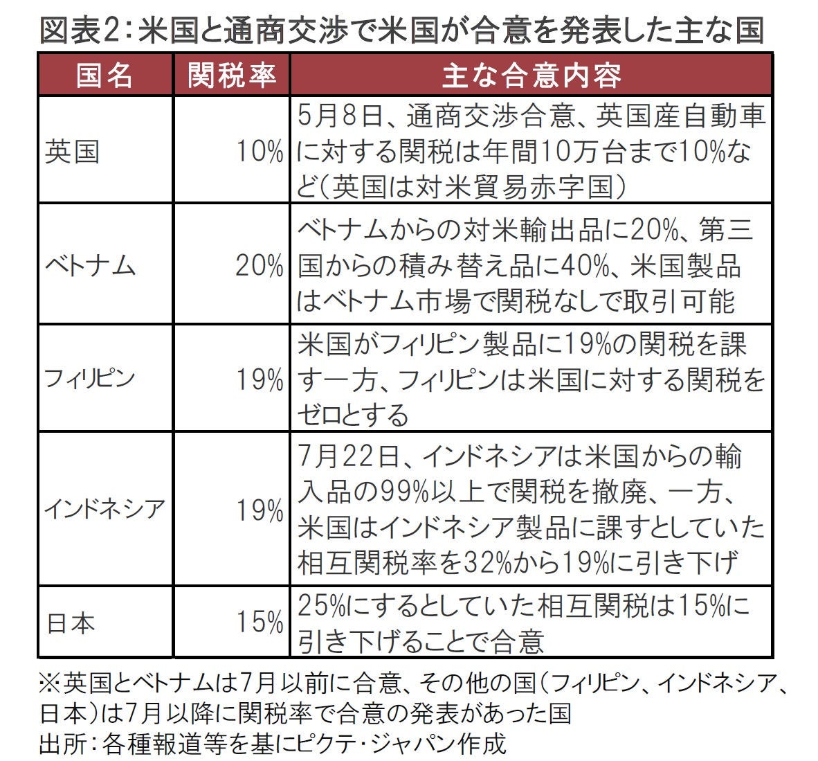 米国との通商交渉を担当した赤沢経済財政・再生相は過去7回訪米し、今回の8回目の交渉で合意に達した。石破首相が指摘するように、対米貿易黒字国の中では、これまでのところ関税率は最も低い15%で合意したと発表された(図表2参照)。また、自動車についても15%で合意できたことは日本経済にとって朗報であろう。