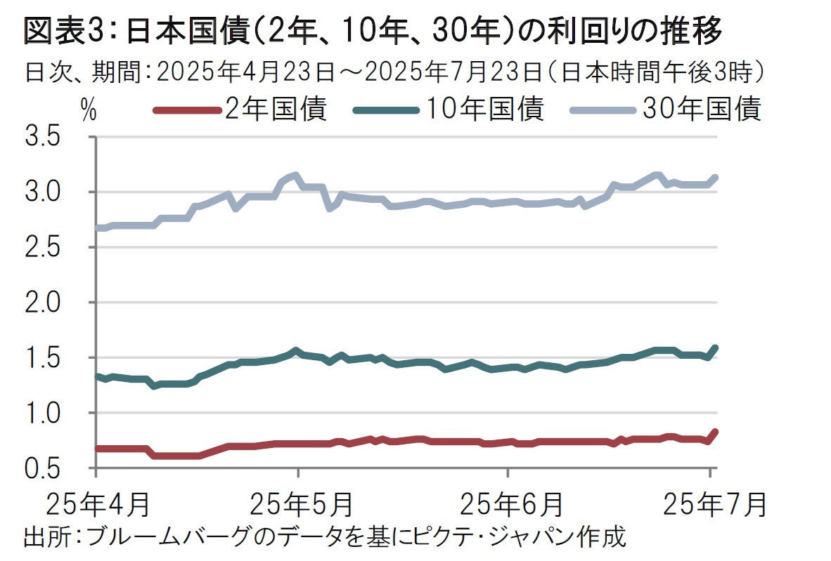 日本の債券市場では、今回の日米合意で短期から長期セクターまで利回りが上昇した(図表3参照)。10年債利回りで見ると1.6%近辺まで上昇したが、主な押し上げ要因はリスクオンだろう。