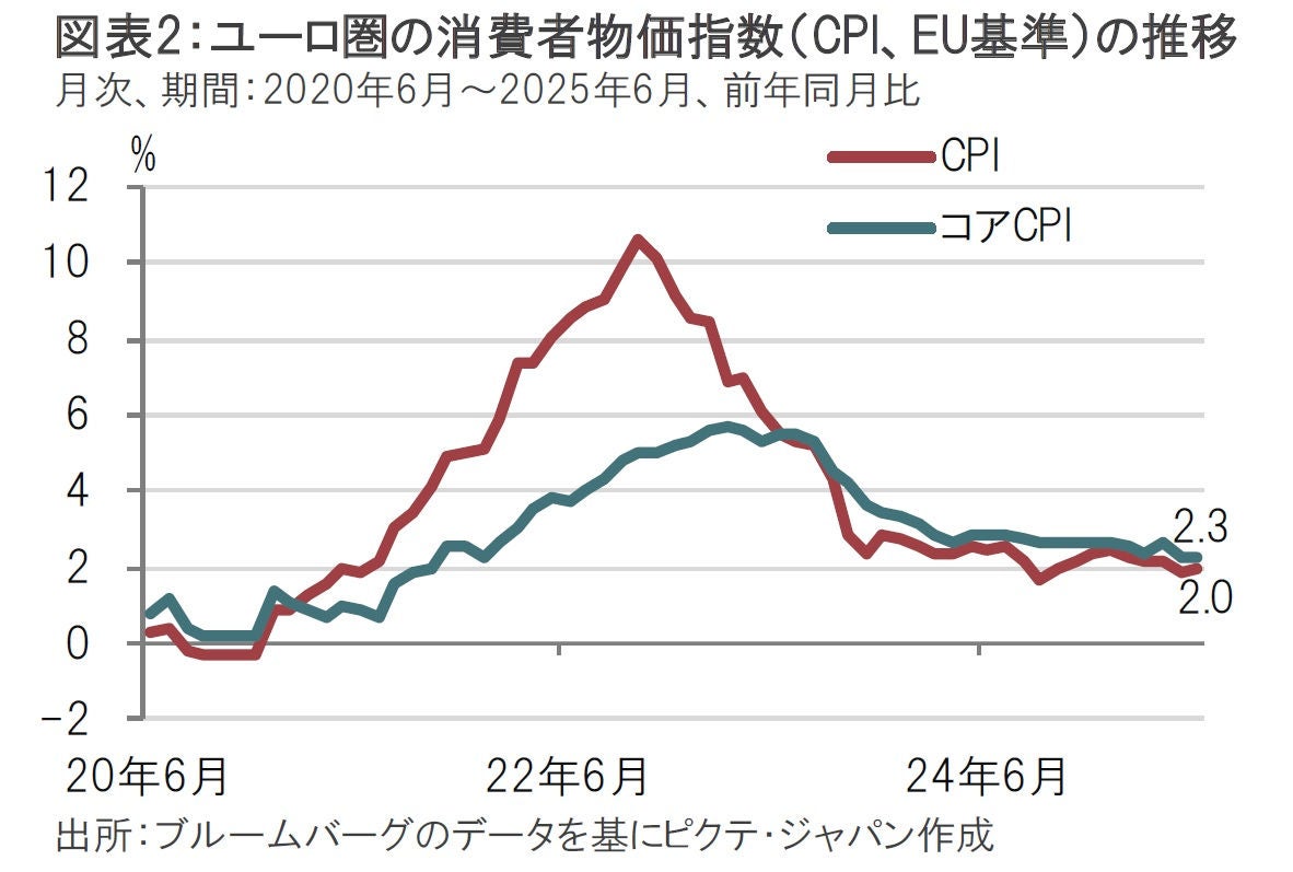 今回のECBの会合を受けて、ユーロ圏の国債の指標であるドイツ国債利回りの動きを確認する。目立ったのは、金融政策を反映しやすい短期セクターで0.1%近い上昇が見られた一方、財政政策などを反映しやすい超長期セクターの上昇は相対的に小幅だったことだ。市場の一部は今回の会合は据え置きであっても、次の9月会合では利下げを再開するとの見方もあったが、会見でラガルド総裁はユーロ圏のインフレ率が2%であると強調し、目先の利下げの必要性を否定した(図表2参照)。