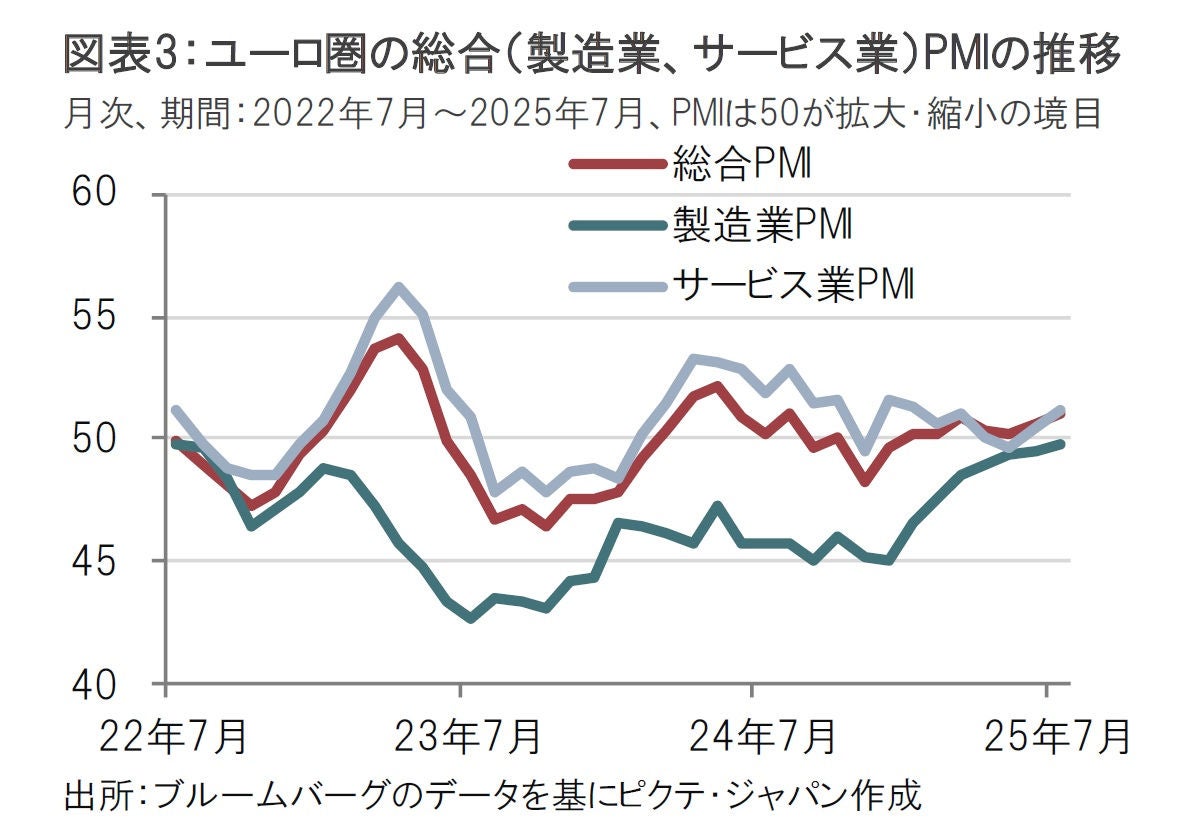 昨日のユーロ圏の金利上昇の(会合以外)背景としてユーロ圏の景況感の回復も挙げられる。会合と同じ24日に発表された7月のユーロ圏総合(製造業、サービス業)購買担当者景気指数(PMI、図表3参照)は51と拡大・縮小の分かれ目である50を超えた。3年に及ぶ不振が続いた製造業PMIも7月は49.8と22年7月以来の高水準で拡大・縮小の分かれ目となる50に近づいた。サービス業は51.2と、市場予想の50.6を上回った。PMIはユーロ圏の景気が様子見を続けたとしても、ある程度は余裕があることを示唆しているようだ。