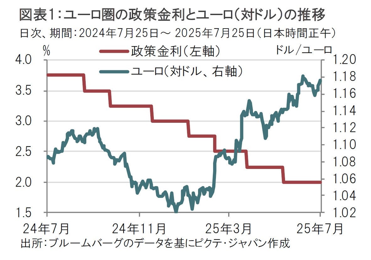 米国との通商交渉、インフレや景気動向以外に金融政策の判断に影響を与えそうなのが、ユーロの動向だ。記者会見でも最近のユーロ高(図表1参照)が物価、ひいては金融政策への影響についての質問が複数あった。ラガルド総裁は為替水準についてはECBの政策目標ではないという前置きをしたうえで、「ユーロの動向がインフレ予想に影響を与えるかモニターしている」と説明した。要は為替動向も気にかけているということだろう。