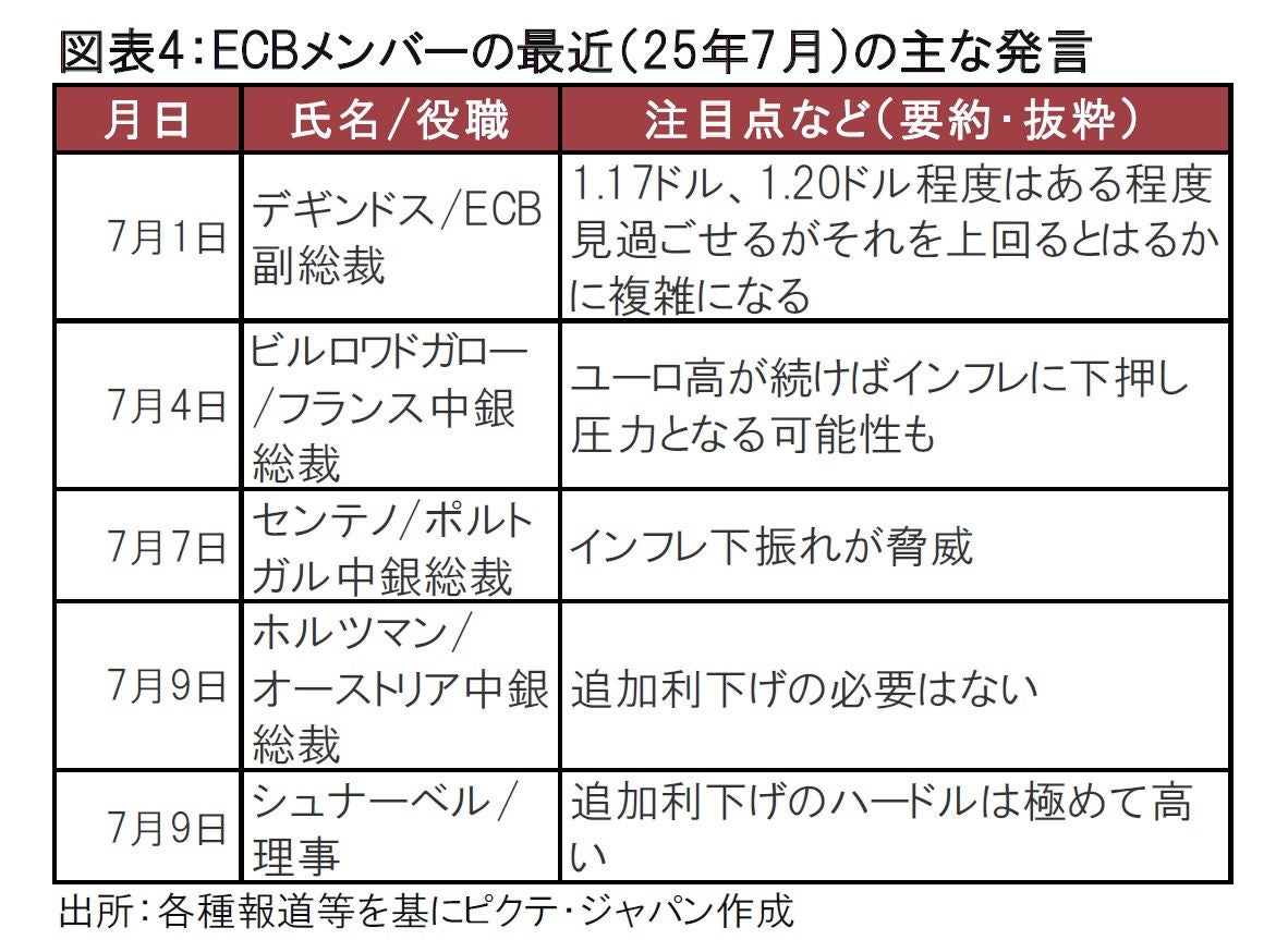 なお、ECBの他のメンバーの発言を見ると、6月会合より後の会合での追加利下げを明確に否定しているのはホルツマン・オーストリア中銀総裁とシュナーベル理事らに限られそうだ。