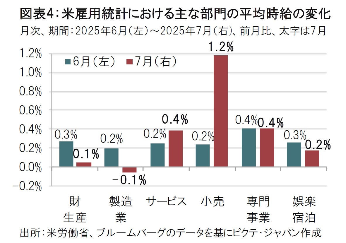そうした中、平均時給は前年同月比では3.9%増と比較的堅調だった。短期的な変動を反映する前月比も0.3%増と、6月を上回った。ただし、前月比の伸びを部門別に見ると、小売りの伸びの影響が大きかった(図表4参照)。7月の小売部門のように部門別データは変動が大きいこともあるだけに、賃金動向については慎重に判断することが求められよう。市場にインパクトを与えた7月の米雇用統計の中にあって、賃金の伸びには底堅さも見られたが、これが続くのかも含めて、米雇用統計を注視し続ける必要がありそうだ。