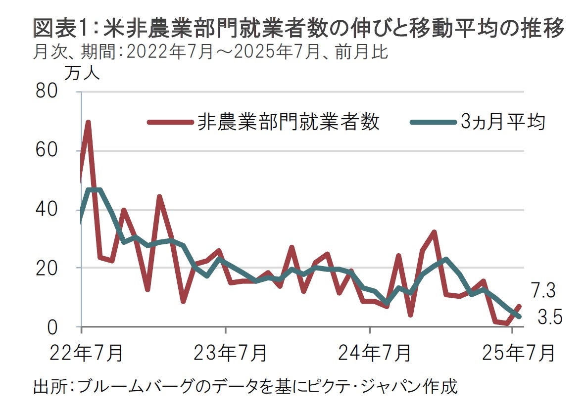 米労働省が8月1日に発表した7月の米雇用統計によると、非農業部門就業者数は前月比7.3万人増と、市場予想の10.4万人増を下回った(図表1参照)。5-6月の伸びは大幅に下方修正され、5月の伸びは14.4万人から1.9万人に、6月は14.7万人から1.4万人に下方修正された。直近3カ月の平均は月3.5万人増となった。