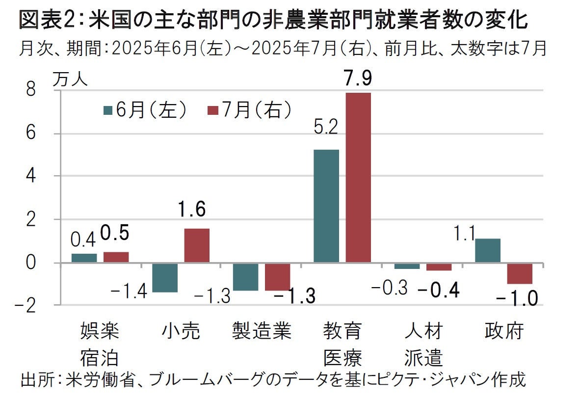 就業者数の伸びを部門別に見ると(図表2参照)、景気に影響されにくい教育・医療部門の伸びが雇用全体の伸びを支える姿となっている。雇用の伸びに幅広さがみられない中で就業者数全体の伸びは市場予想を下回ったこととなる。また、6月堅調だった政府部門は7月に伸び悩んだうえ、6月分は速報値の7.3万人増から1.1万人増に大幅に下方修正された。1か月前の当レポートで、米国では6月が学年末となる中、公立校の教員の採用などで高め可能性があり、可能性があると見ていたが、今回の下方修正幅は想定以上だった。