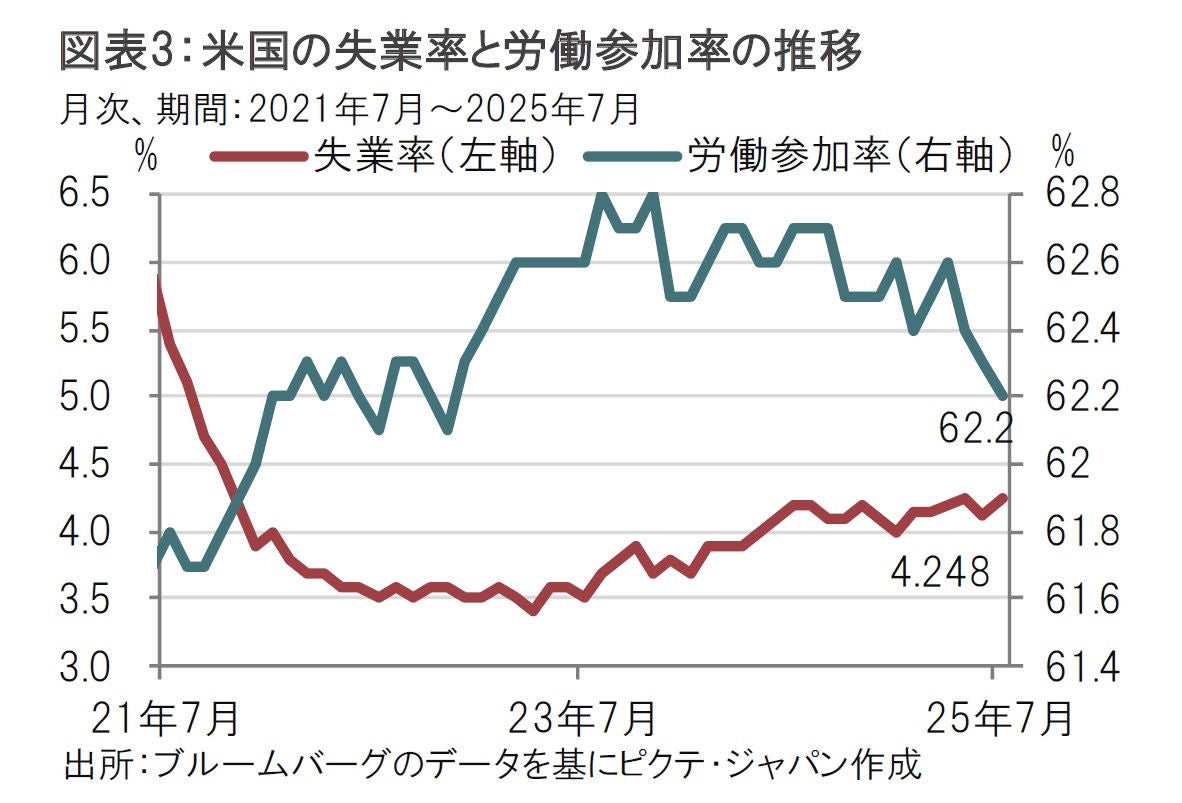 次に失業率は7月が4.2%と水準としてはFRBの長期見通しに一致する水準だった。しかし小数点以下第3位まで見ると4.248%で実態は4.3%に近いうえ、失業率はじりじりと上昇傾向だ(図表3参照)。