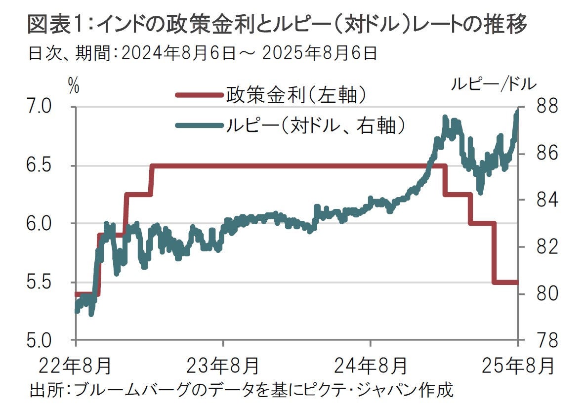 インド準備銀行(中央銀行)は8月6日、政策金利(レポ金利)を5.5%で据え置くと決めた(図表1参照)。インドは関税を含めた対米貿易交渉が難航していることや、通貨ルピー安が進行する中、国内経済への影響など見極めて政策金利を据え置いた。据え置きは4会合ぶり。前回会合では景気下支えから0.5%の大幅利下げに踏み込んだ一方で、利下げ余地が小さいことも表明した。