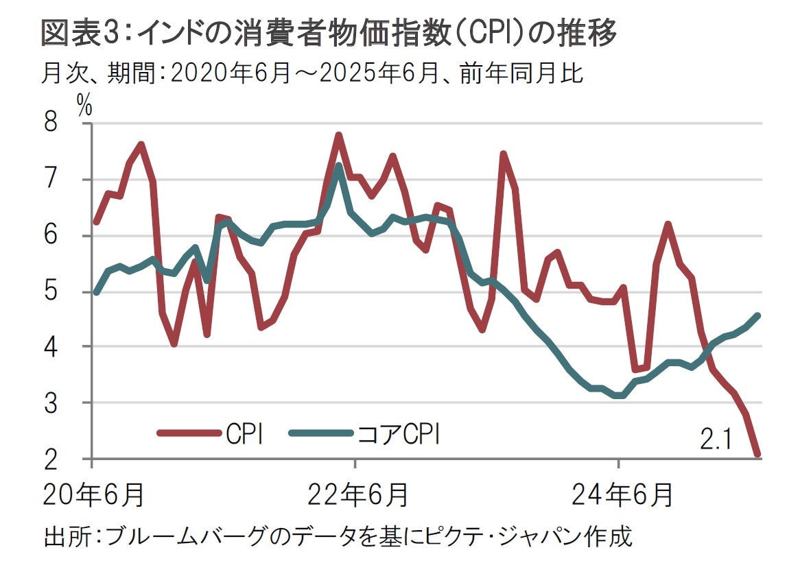 インド中銀は今回の会合で25/26年度のインフレ見通しを3.1%に引き下げたが、現実のインフレ率である消費者物価指数(CPI)は6月が前年同月比で2.1%上昇と、見通しを下回っている(図表3参照)。また来週発表予定の7月分のCPIでは伸びが1%台にさらに鈍化することが見込まれている。