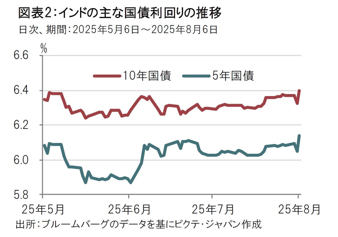 インド中銀は今回の会合で政策金利を据え置いたが、市場予想通りでサプライズはない。前回(6月)会合では大幅な利下げが行われたため追加利下げ余地が縮小したことと、政策スタンスを利下げ「緩和」(利下げを前提)から「中立」(基本中立)としていたことから、8月の据え置きは確実視されていた。ただし、前回の会合での大幅利下げと金融姿勢の「中立」という組み合わせに市場は混乱した。主に2通りの解釈、①利下げは6月で停止、②当面据え置き姿勢ながら利下げも選択肢、があったが、①の見方が強く、そのためインド国債利回りは6月会合後に急上昇した(図表2参照)。