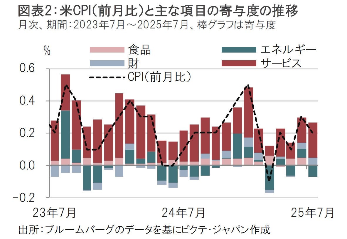 7月CPIの伸びには関税の影響(物価押し上げ)は明確に示されなかった。総合CPIの前月比の伸び(7月は0.2%上昇)を、エネルギー、食品、財、及びサービスの4項目に分けて寄与度を見ると(図表2参照)、関税の影響が大きいとみられる財項目は前月比0.2%上昇と6月から横ばいだった。