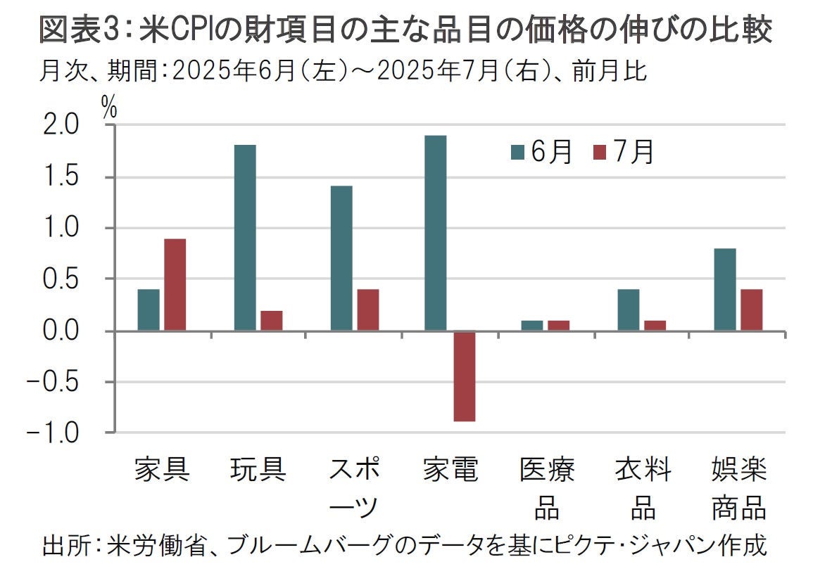 財の中で、家具や玩具など輸入割合が高く関税の影響を受けやすい品目について6月と7月の価格の伸びを前月比で見ると、家具(6月0.4%→7月0.9%)のように前月を上回った品目もあるが、玩具、スポーツ用品、家電、衣料品などは前月を下回った(図表3参照)。家電(0.9%→-0.9%)のように下落に転じた品目も見られた。