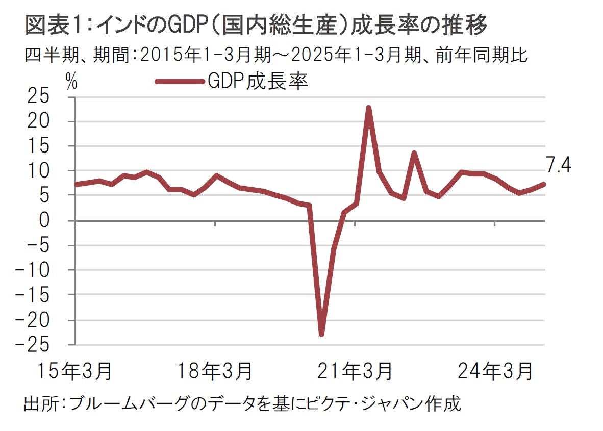 S&Pは声明文で、主な格上げの理由として、インドの堅調な経済成長を挙げている。インド政府が5月末に発表した1-3月期のGDP(国内総生産)成長率は前年同期比で7.4%増と、市場予想の6.8%増、24年10-12月期の6.4%増を上回った(図表1参照)。インド政府は8月29日に4-6月期のGDPを発表する予定だ。市場予想を見ると、前年同期比で6.5%程度の伸びが見込まれている。