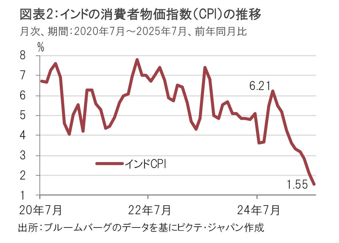 成長率の押し下げは昨年10月には6%を超えたインフレによる消費者マインドの悪化と、物価対応による高金利政策が考えられる。しかし、インドの消費者物価指数(CPI)は最新の25年7月分が前年同月比で1.55%にまで鈍化している(図表2参照)。インド準備銀行(中央銀行)は物価の落ち着きを確認した上で、今年2月に利下げを開始した。