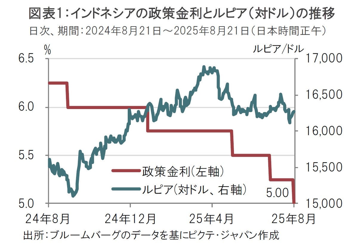 インドネシア中央銀行は8月19日~20日に開催した金融政策決定会合(会合)で、市場予想の据え置きに反し、政策金利(7日物リバースレポ金利)を0.25%引き下げ、5.00%に決定した(図表1参照)。利下げは7月に続き2会合連続となる。昨年9月からの利下げ幅は合計して1.25%となった。米国の相互関税などで世界経済に不透明感が強まるなか、景気のてこ入れを急いでいる。