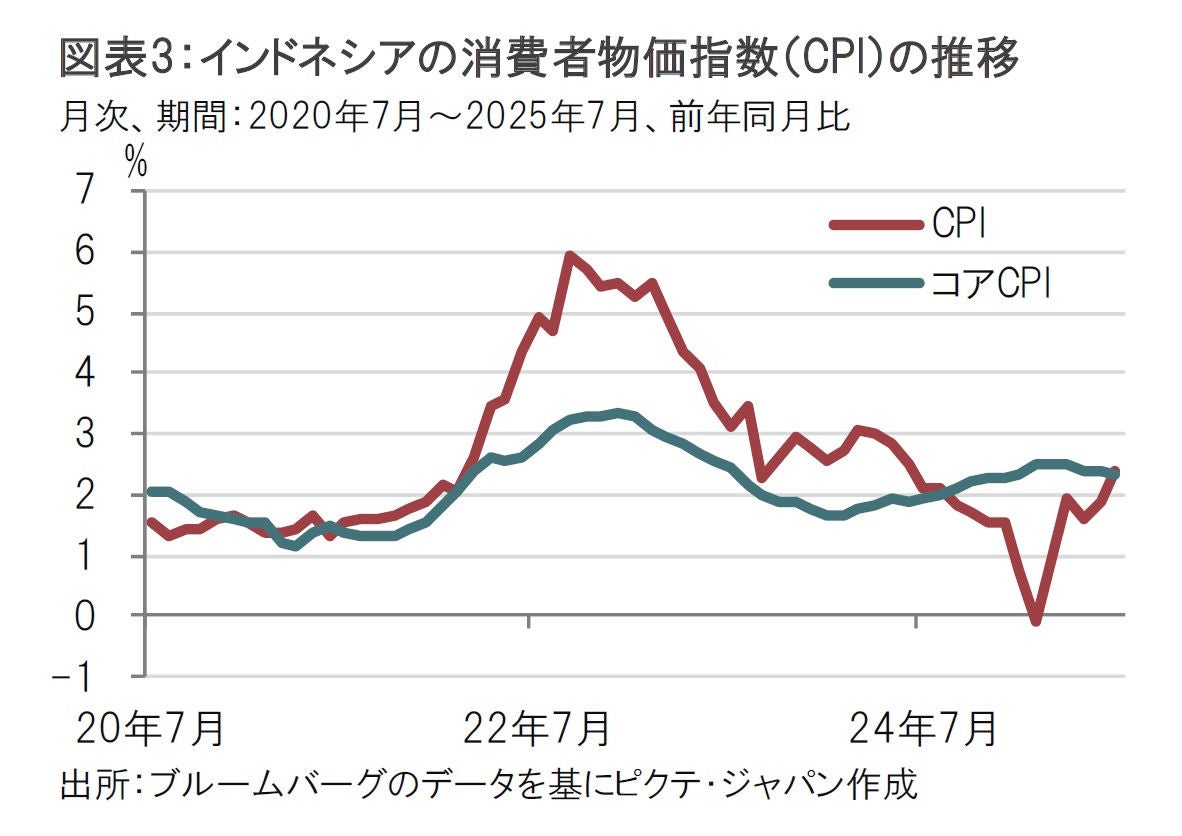 1つ目は物価の落ち着きだ。インドネシアの7月の消費者物価指数(CPI)は前年同月比で2.37%上昇と、インドネシア中銀の物価目標(2.5%±1%)の中心付近に収まっている(図表3参照)。変動の大きい項目を除いたコアCPIも同様だ。