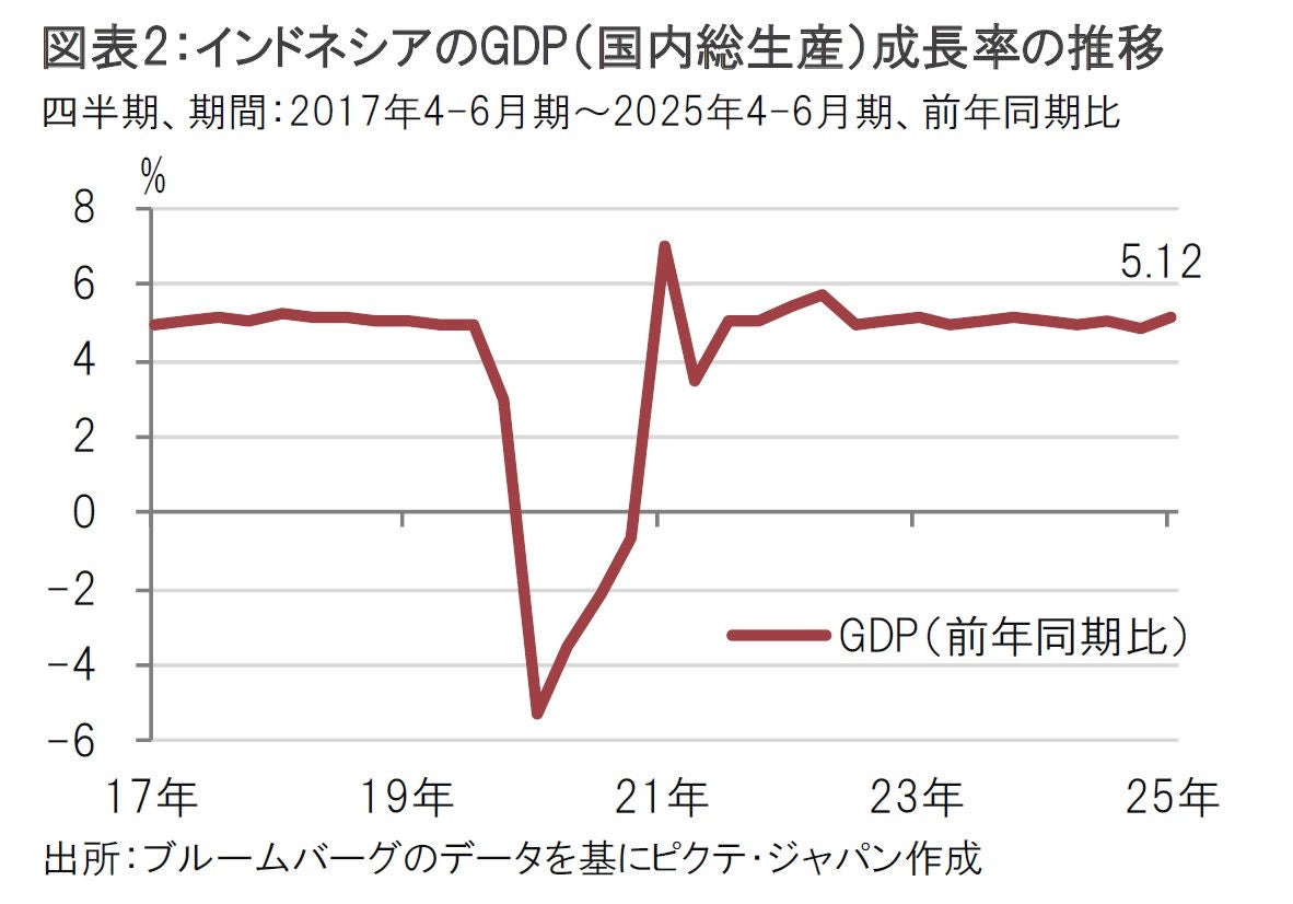 市場では大半(75%程度)が、今回の会合でインドネシア中銀は据え置くと見込んでいた。主な理由は2週間(8月5日)程前に発表された4-6期GDP(国内総生産)成長率が5.12%増と、市場予想の4.8%増を上回るなど堅調であったことが大きいとみられる(図表2参照)。