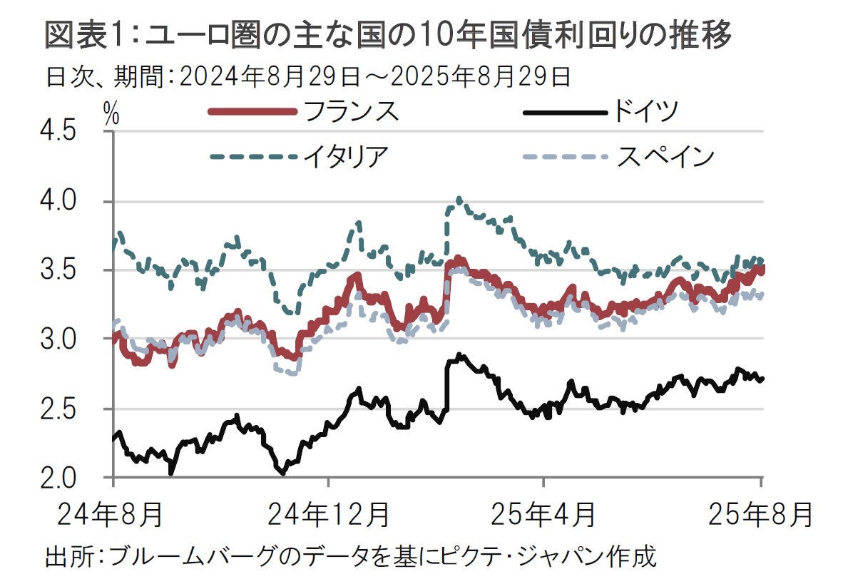 フランスのバイル首相は8月25日に信任投票を実施すると発表したのは、26年度予算案審議が本格的に始まる前に議会による信任を得る狙いと見られる。フランスの財政問題に市場の目が向き始めてから、フランス国債利回りは上昇(価格は下落)傾向で、ドイツ国債との利回り格差(スプレッド)は拡大傾向だ(図表1参照)。