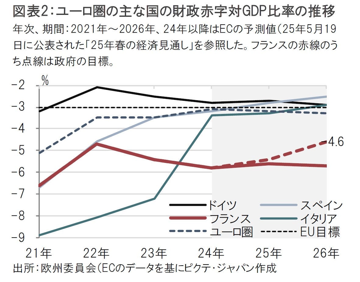 フランスの財政赤字対GDP(国内総生産)比率は24年が5.8%(マイナスは赤字の意味なので省略)と、他のユーロ圏の主要国を大幅に下回る(図表2参照)。欧州委員会(EC)が5月に発表した「25年春の経済見通し」によると、25年は5.6%、26年は5.7%と、フランスの財政状況は今後についても改善の余地が乏しいと見込まれていた。