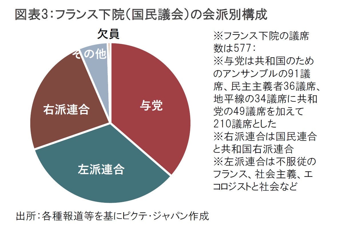 しかし、バイル政権は26年予算案を前に、前政権と同様の困難に直面している。今年2月に25年予算を成立させたとはいえ、少数与党であることについては、前政権と変わりはない(図表3参照)。フランス下院は定数577議席だが、与党は過半数を下回るとみられ、信任投票の可決、つまり26年予算案の通過には野党の協力が必要だ。