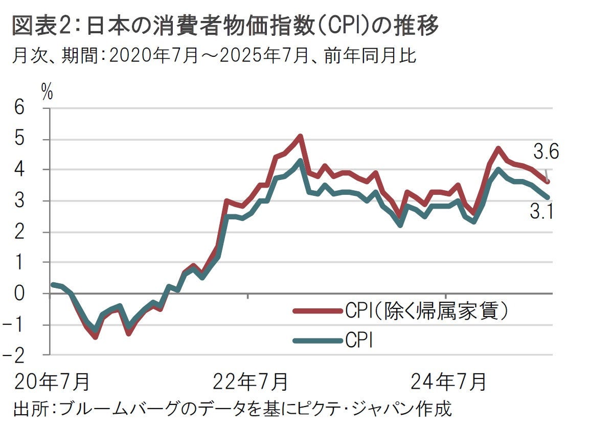 毎月勤労統計では実質賃金の算出に従来から消費者物価指数(CPI:持ち家の家賃換算分である帰属家賃を除いた総合)を使用している。7月の上昇率は3.6%と、6月の3.8%上昇を下回ったが、物価目標の2%を大幅に上回ったままである。