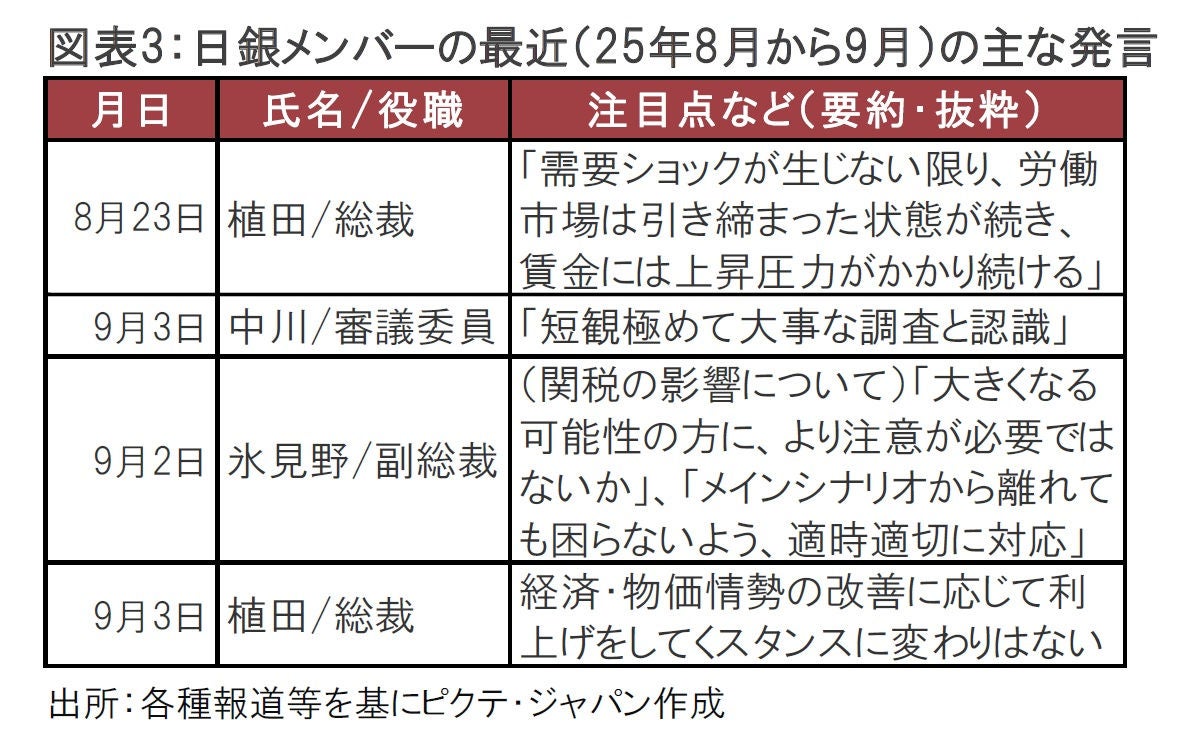 今回の毎月勤労統計は日銀の追加利上げの決め手とはならないとしても、後押しする材料となりそうだ。最近の日銀メンバーの発言(図表3参照)を参考に、今後の注目点を考える。