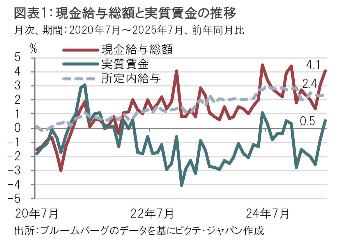 厚生労働省が発表した7月の毎月勤労統計によると、名目賃金は前年同月比4.1%増と市場予想を上回り、実質賃金も0.5%増加した。特別給与の伸びが大きく寄与し、今後はこの効果が薄れる見通し。日本の物価は足元鈍化傾向にあるが、持続的な実質賃金のプラスには賃金の着実な上昇が必要。日銀の追加利上げ時期は短観や関税の影響を見極めつつ、12月または来年1月が有力と考えている。