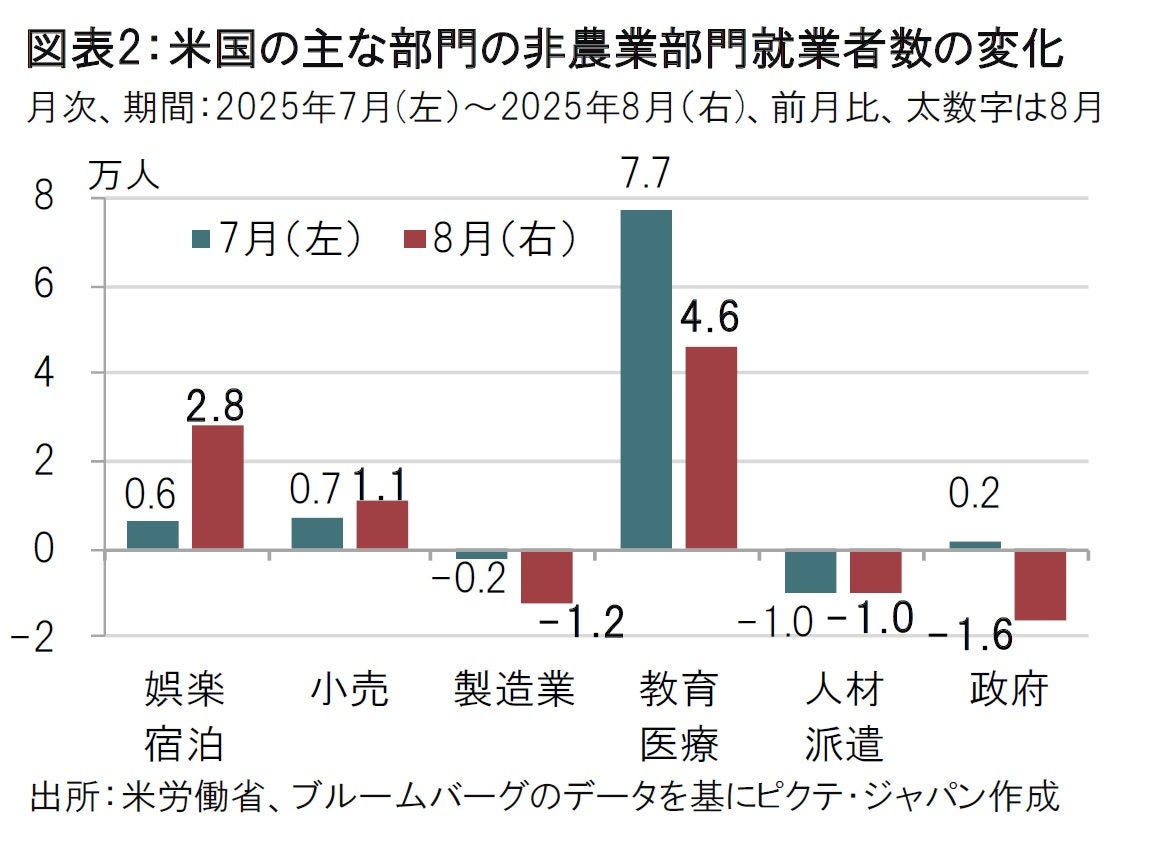 就業者数の伸びは1〜4月に月平均12.2万人のペースで増えていたが、5〜8月に2.7万人増まで鈍った。就業者数の伸びを部門別でみても、比較的堅調だったのは娯楽・宿泊や小売りなどに限られる(図表2参照)。「製造業」や「人材派遣業」,に加え図表にはないが「建設業」など幅広い業種で雇用はマイナスに転じている。また、人手不足などを背景にこれまで雇用をけん引してきた「教育・医療」の採用の勢いは鈍化した。これが一時的なものなのかは注意する必要がある。