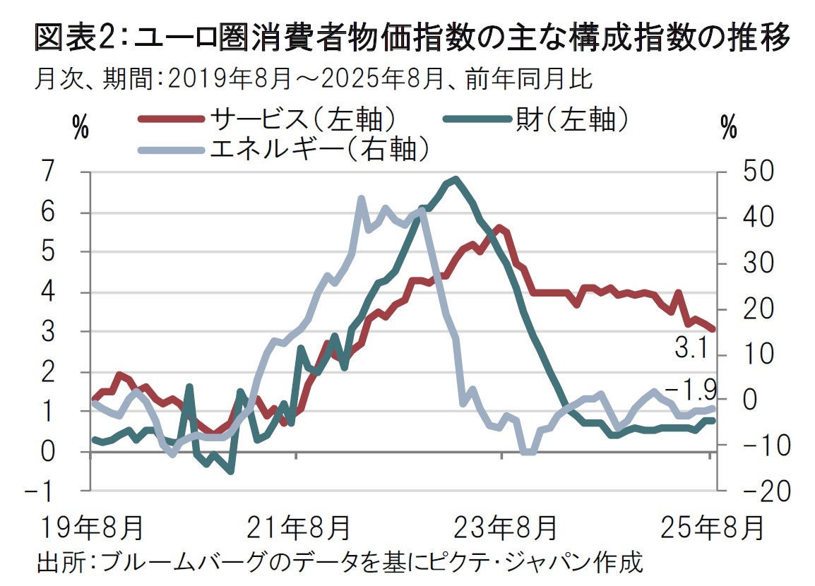 注目は消費者物価指数(HICP)であろう(図表2参照)。8月は総合HICPが前年同月比で2.1%上昇と概ね見通し並びに物価目標通りだった。しかし、構成指数で内訳をみると、サービスは鈍化傾向だが高水準だ。一方、衣料品などモノの価格を反映する財は関税の影響を受けやすいとみられるが、足元は低水準だ。ただし今後は上昇する可能性を懸念する声もある。シュナーベル理事は「関税は差し引きでインフレ要因」と発言しており、インフレリスクは上方向を見込んでいるようだ。