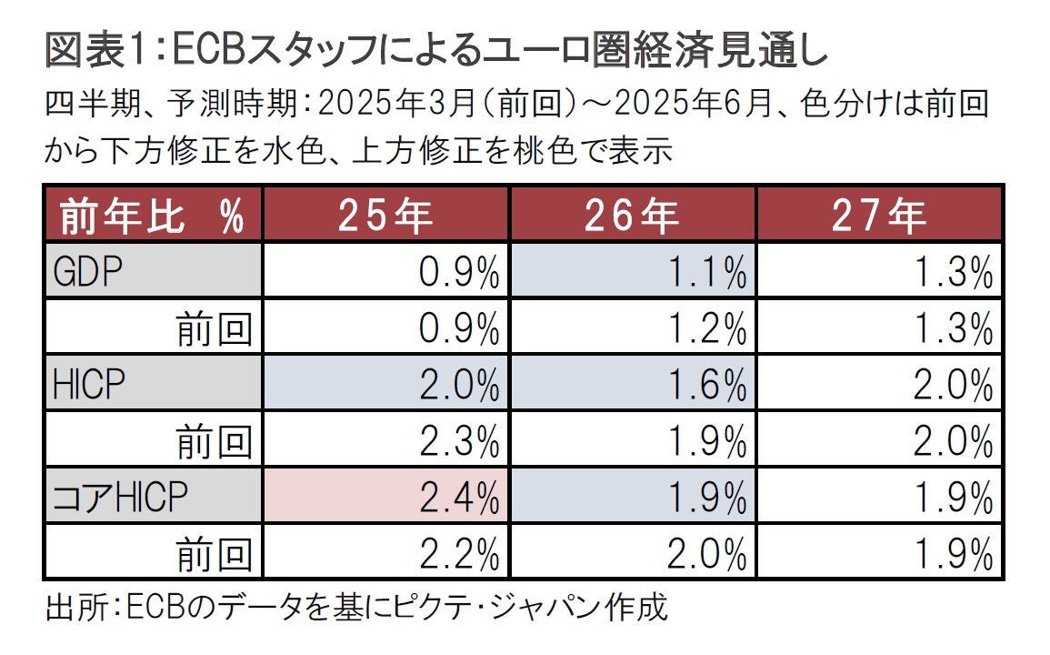 まず、ECBの今後の金融政策を占ううえでは、今回更新される経済見通しが注目される。筆者はユーロ圏の成長率は25年、26年ともに1.3%増を見込んでいる。今回の更新で、25年に加え、26年についても小幅ながら上方修正の余地があるように思われる。